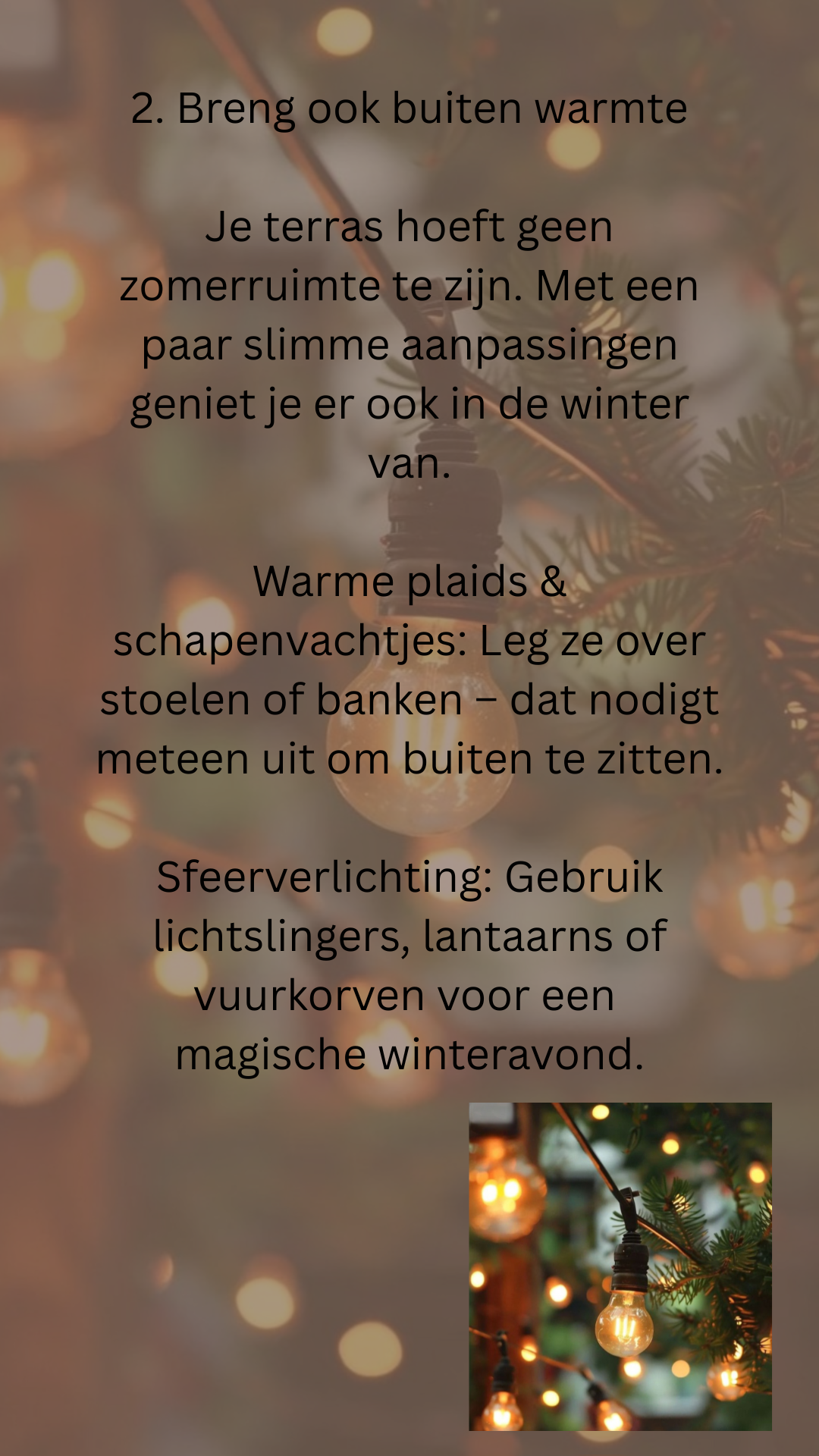 Verlichting: Kaarsen, lantaarns en zachte sfeerverlichting zijn onmisbaar. Zet een paar kleine lampjes op verschillende hoogtes voor een warme gloed in de ruimte.